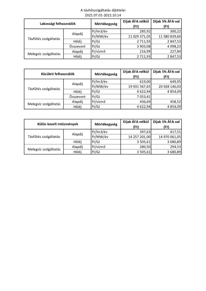 A távhőszolgáltatás díjtételei 2021.07.01-2022.10.14-ig