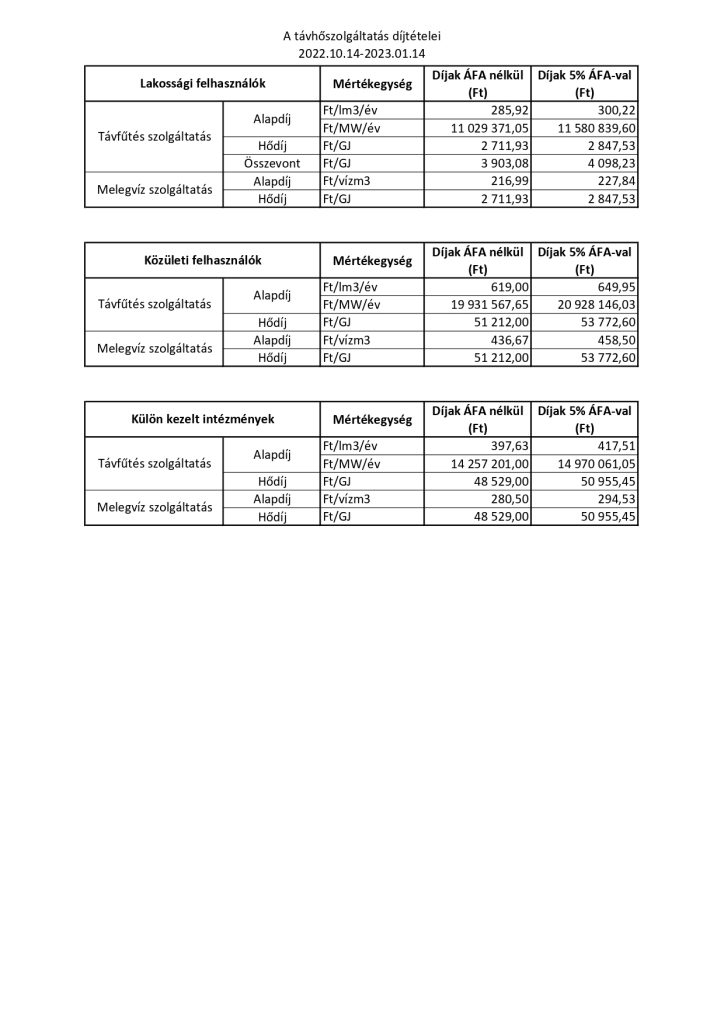 A távhőszolgáltatás díjtételei 2023.01.15-2023.10.14-ig