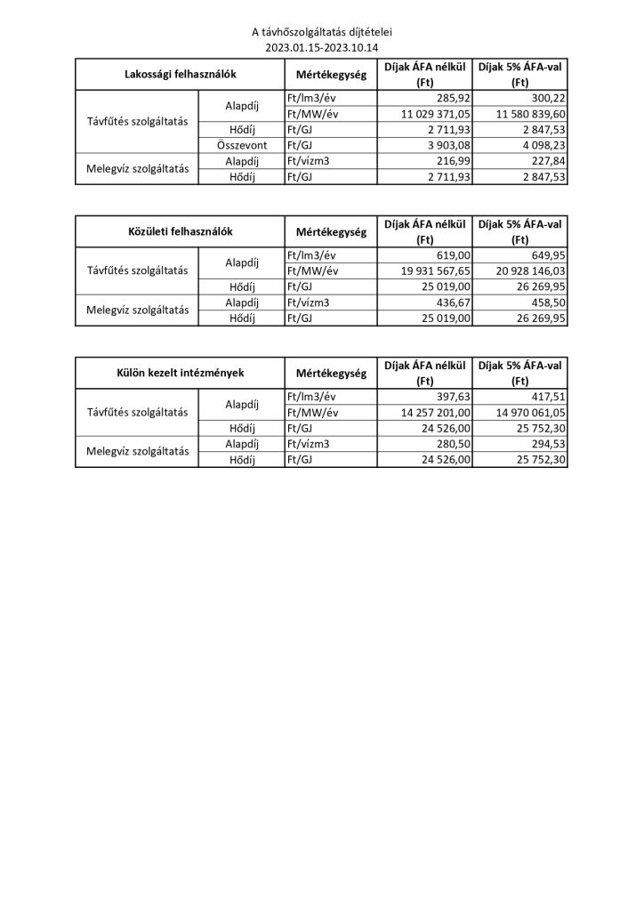 A távhőszolgáltatás díjtételei 2023.10.15-2024.10.14-ig